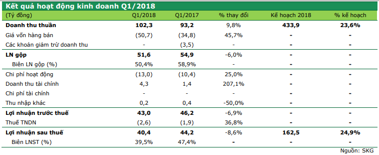 Trong Q1/2018, tổng doanh thu thuần của SKG đạt 102,3 tỷ đồng, tăng 9,7% theo năm nhưng biên lợi nhuận gộp sụt giảm xuống mức 50,4% so với mức 58,9% của cùng kỳ. Nguyên nhân chính do áp lực cạnh tranh từ các đối thủ mới và chủ trương mở rộng hoạt động khiến cho (1) tổng số giờ khởi hành tăng lên trong khi giá vé không thay đổi, hiệu quả khai thác trên từng tuyến vận chuyển giảm do lượng khách hàng được phân bố ra nhiều khung giờ khác nhau; (2) chi phí nhiên liệu (dầu diesel) tăng theo diễn biến của giá dầu thô thế giới, số giờ khởi hành và chi phí khấu hao (2 tàu cao tốc mới) đều tăng. Chỉ tiêu giá vốn hàng bán trong kỳ đạt 50,7 tỷ đồng, tăng 45,8% so với cùng kỳ. Cụ thể, chi phí nhiên liệu đạt 24,3 tỷ đồng, tăng 54,2% so với cùng kỳ. Chi phí khấu hao đạt 9,7 tỷ đồng, tăng 34,9% so với cùng kỳ; chi phí nhân công đạt 8,7 tỷ đồng, tăng 56,9% so với cùng kỳ.