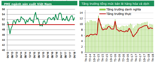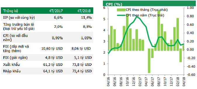 Chỉ số sản xuất công nghiệp (IIP) tháng 4/2018 tăng 1,5% so với tháng trước và tăng 9,4% so với cùng kỳ năm trước. Tính chung 4 tháng đầu năm 2018, chỉ số sản xuất toàn ngành công nghiệp tăng mạnh 11,4% so với cùng kỳ năm trước, cao hơn nhiều so với mức tăng 6,6% của cùng kỳ năm 2017. Tính chung 4 tháng đầu năm, ngành công nghiệp chế biến chế tạo tăng 14% so với cùng kỳ, đóng góp 10,6 điểm phần trăm vào mức tăng chung; ngành sản xuất và phân phối điện tăng 9,7%, góp 0,9 điểm phần trăm; ngành cung cấp nước và xử lý rác thải, nước thải tăng 5,5%, đóng góp 0,1 điểm phần trăm; ngành khai khoáng giảm 1,2%, làm giảm 0,2 điểm phần trăm.