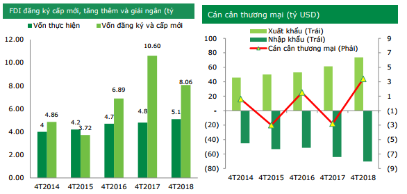 Tính chung 4 tháng 2018, xuất khẩu ước tính đạt 73,76 tỷ USD, tăng 19% so với cùng kỳ. Nhập khẩu ước đạt 70,37 tỷ USD, tăng 10,1% so với cùng kỳ. Như vậy, Việt Nam ước tính xuất siêu 3,39 tỷ USD tính chung 4 tháng đầu năm (riêng tháng 4 xuất siêu 700 triệu USD), đạt 4,6% tổng kim ngạch hàng hóa xuất khẩu. Trong đó, khu vực kinh tế trong nước nhập siêu 7,78 tỷ USD; khu vực có vốn đầu tư nước ngoài (kể cả dầu thô) xuất siêu 11,17 tỷ USD.