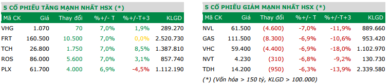 VNM tăng phiên thứ hai và cổ phiếu bán lẻ phục hồi mạnh mẽ nhờ hiệu ứng FRT. VNM (+2,2%) trở thành mã đóng góp nhiều thứ hai cho thị trường chung với 2,1 điểm trong bối cảnh định giá trở nên hấp hơn hơn và khối ngoại mua ròng. Tương tự, MSN (+2,9%) phục hồi sau phiên lao dốc hôm qua. Cổ phiếu bán lẻ có ngày giao dịch thành công với MWG, PNJ phục hồi tốt trong khi FRT tăng kịch trần ngày thứ hai sau khi khối ngoại mua ròng mạnh mẽ.