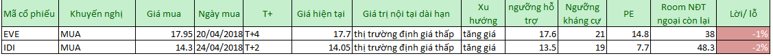 Kết thúc phiên giao dịch ngày 27/04/2018 chỉ số VN-Index đóng cửa tại 1050.26 điểm tăng 5.4 điểm so với phiên ngày hôm trước tuy tăng điểm nhưng thanh khoản thị trường đạt 152.8 triệu cổ phiếu giảm tương ứng 32.1 triệu so với phiên hôm trước độ rộng thị trường nghiêng về các mã tăng với 188 mã tăng và 98 mã giảm điểm do sự tăng giá từ các cổ phiếu VCB, VNM, PLX, và CTG dẫn đến sự lan tỏa của dòng tiền
